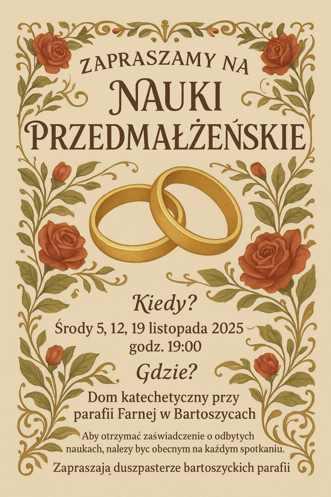 Organizujemy Nauki Przedmałżeńskie. Spotkania odbędą się w środy 5, 12 i 19 listopada 2025 o godz. 19.00 w Domu Katechetycznym przy parafii Farnej. Aby uzyskać zaświadczenie o odbytych naukach należy być obecnym na wszystkich spotkaniach.